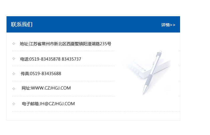 地址:常州市新北區友邦商務大廈1幢16、17層  電話:0519-85101652  傳真:0519-85112595  郵編:213022  網址:www.cz-jiayue_cn.lyasn.com  郵箱:xiajifengaa@163.com